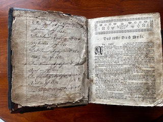 Recently, one of my nieces, Crystal Miracle, brought an old family Bible to one of our family gatherings for me to examine.  She knew her Uncle John likes old books and is interested in anything to do with history.  Bound in calfskin, missing the clasps and the title page, the Bible is otherwise in good condition. Birth records are written in it dating between 1777 and 1792.  It is printed in German.  It spent several decades in an attic in Henry County owned by a family friend that used to keep several of my nieces when they were children, and who gave it to Crystal because she had expressed an interest in it.   It was clear this was something special, so I did some research on it.