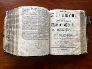 Crystal’s Hausbieble is one of the few copies that was bound before the British troops turned the unbound pages into horse bedding and rifle cartridges.